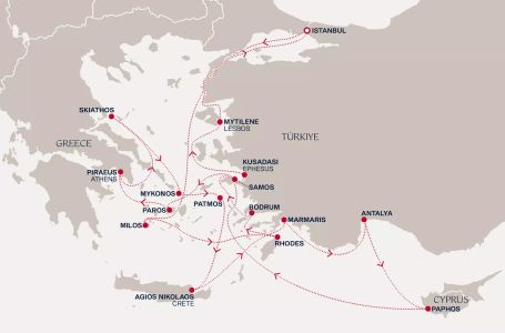 * Цените са на човек и с вече калкулирани отстъпки, ако има промоция. Включват всички такси, сервиз, all inclusive напитки и интернет на борда.- Маршрут на круиза: Istanbul - В открито море - Milos - Rhodes - Bodrum - Samos - Paros - Athens (Piraeus) - Skathos - Mykonos - Patmos - Agios Nikolaos (Crete) - Marmaris - Antalya - Paphos - В открито море - Kusadasi - Mytilene (Lesbos) - В открито море - Istanbul